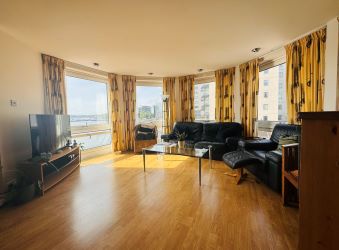 The property which covers approx. 872sq2 comprises an entrance hallway with storage, a bright and airy living room with access to a balcony overlooking the water, a separate fitted kitchen equipped with integrated appliances, two bedrooms, and a bathroom. The property features wooden flooring throughout the main living areas, neutral decor, and ample natural light from large windows. Externally, the development includes communal gardens, secure parking, and direct access to waterfront walks.